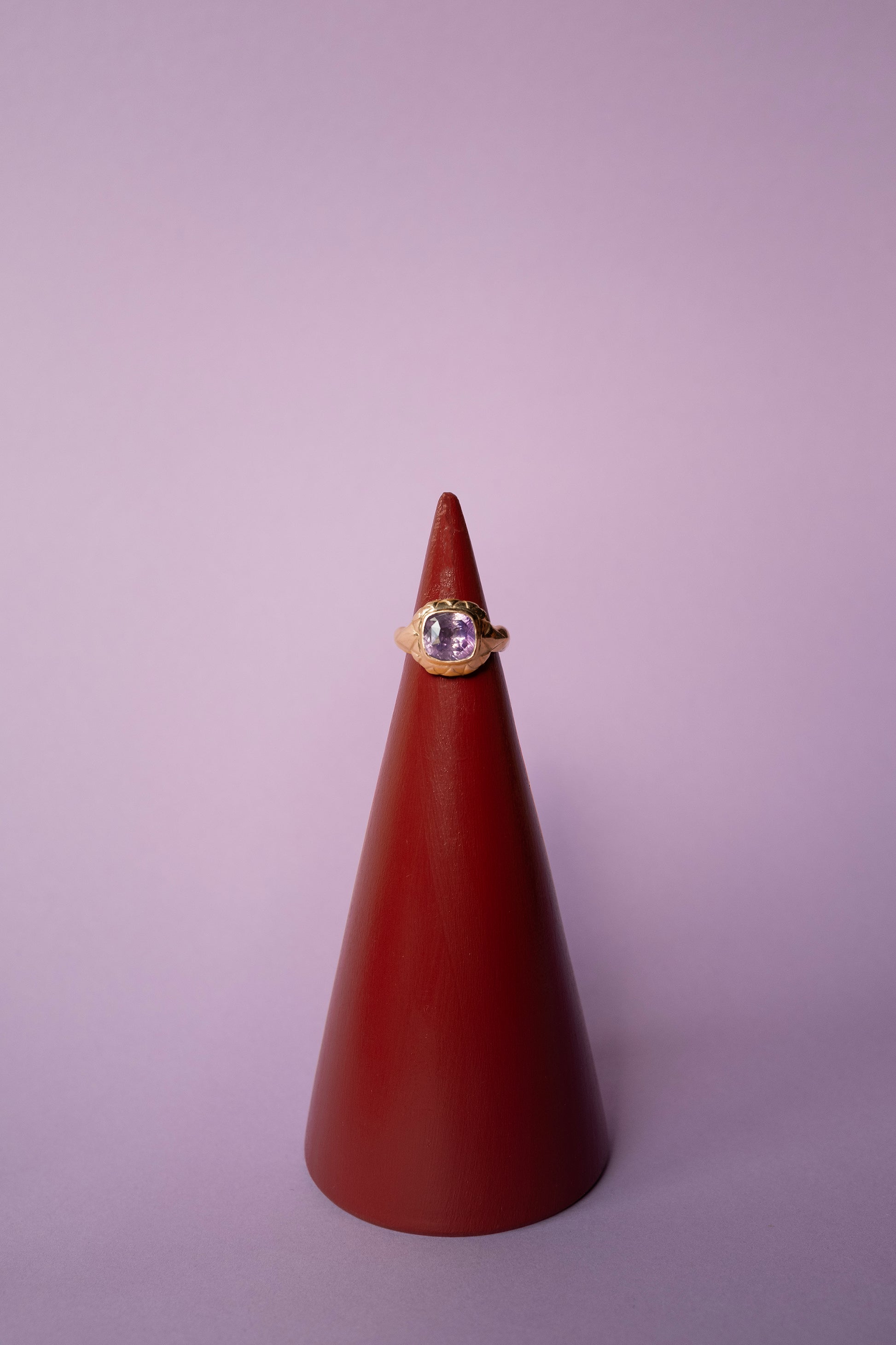 Crafted by hand from wax and cast in a gold weight of choice: 18 carat, 20 carat or 22 carat gold. All gemstones will be sourced custom per order. The piece shown here is set with a lilac sapphire and for sample functions only. Please send us an email if you require more information on options of gemstones and pricing, we are happy to help you find the perfect gemstone: info@rosadeweerd.com