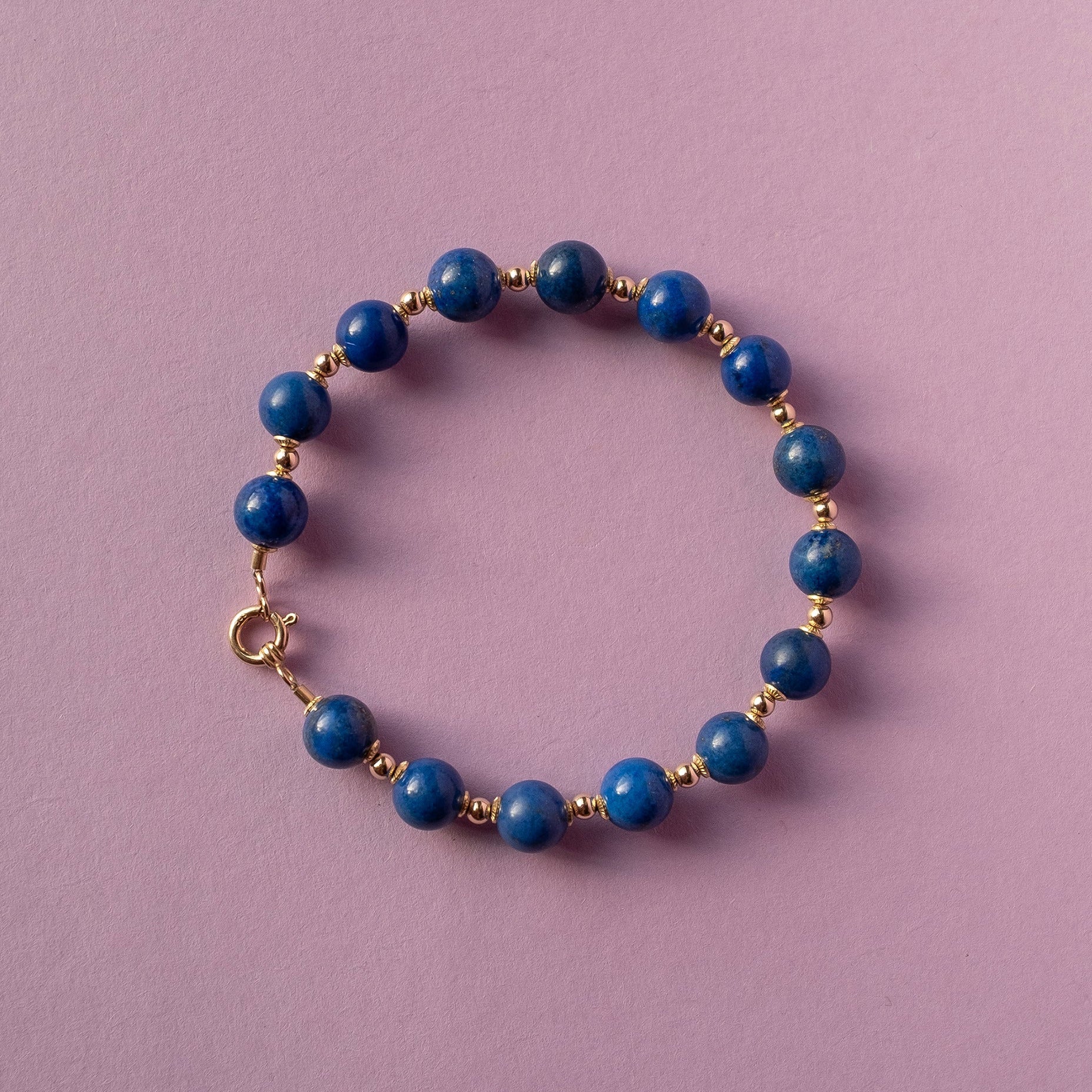 Every piece is custom made with 14k gold details, strung on iron-wire for strength and durability. Made with incredible quality of vintage, vibrant blue Afghan lapis lazuli beads. Length of the bracelet is approx. 19cm which can be customized. Closes with a sophisticated 14k round clasp, which can also double as a charm-holder.