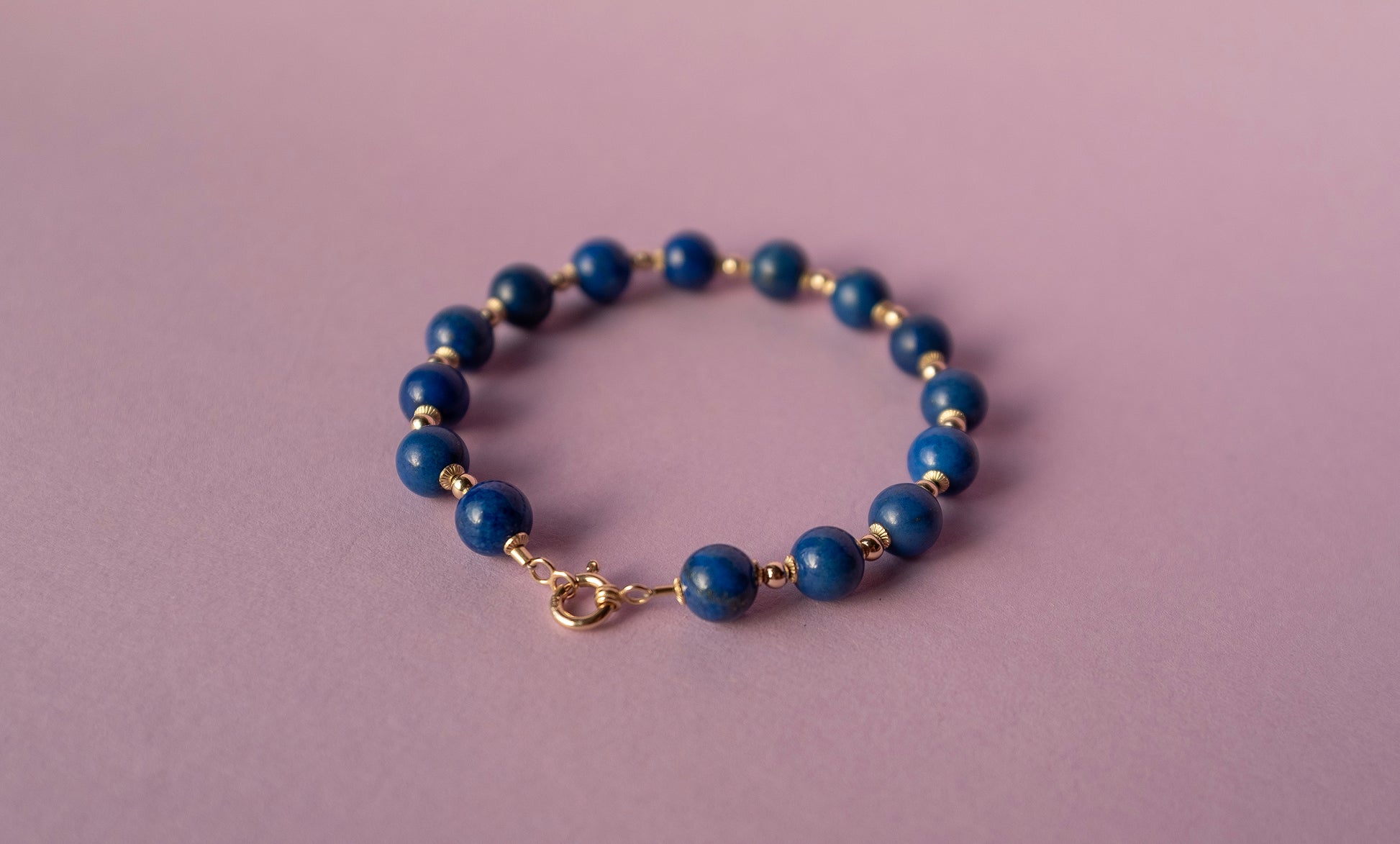 The Bara Bracelet is composed of vivid Afghan lapis lazuli, spaced with soft gold for balance and warmth. The lapis carries a clear, calming depth, a blue that feels both steady and quietly luminous. Worn on the wrist, it has an ease to it: refined, timeless, a grounded piece, made to be lived with and worn often.