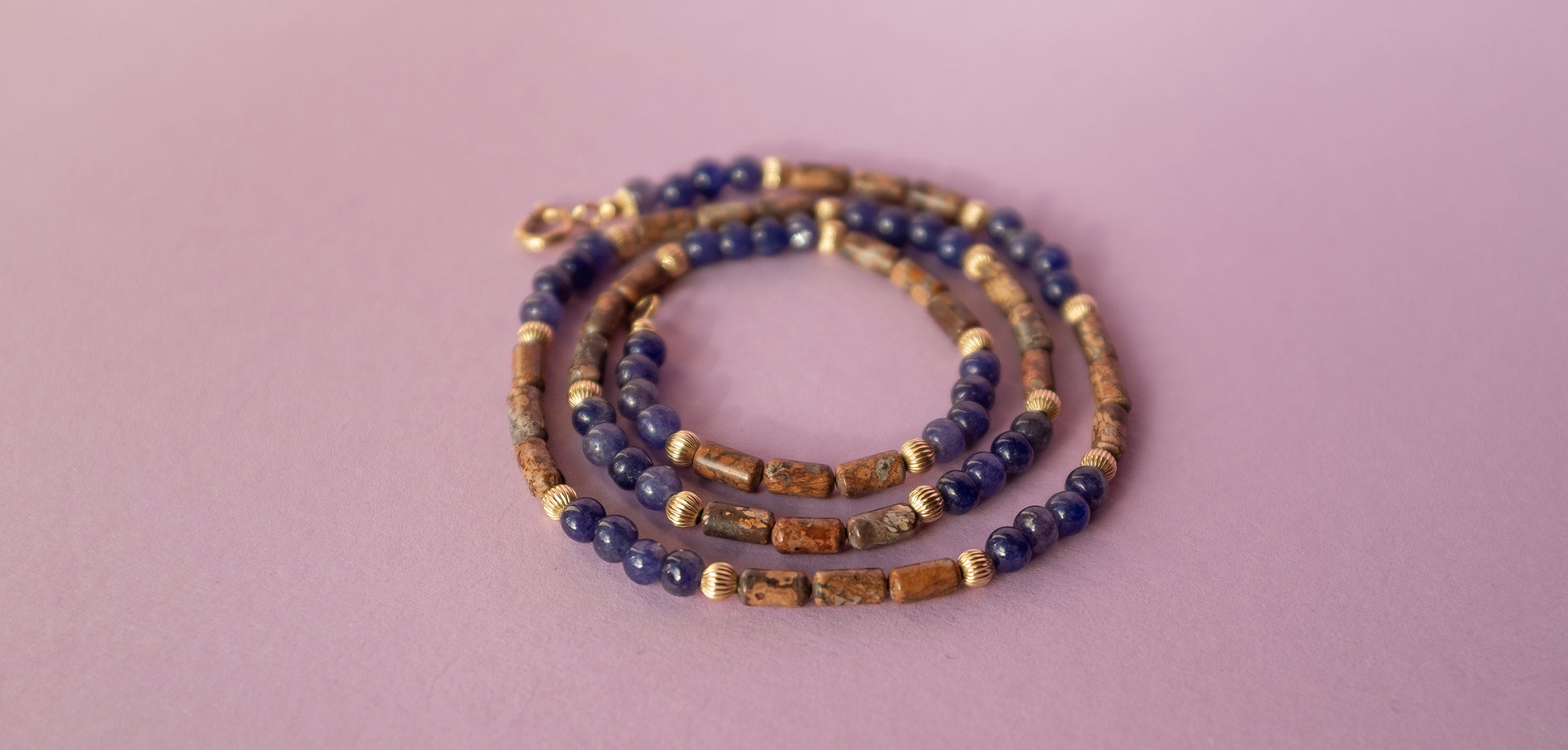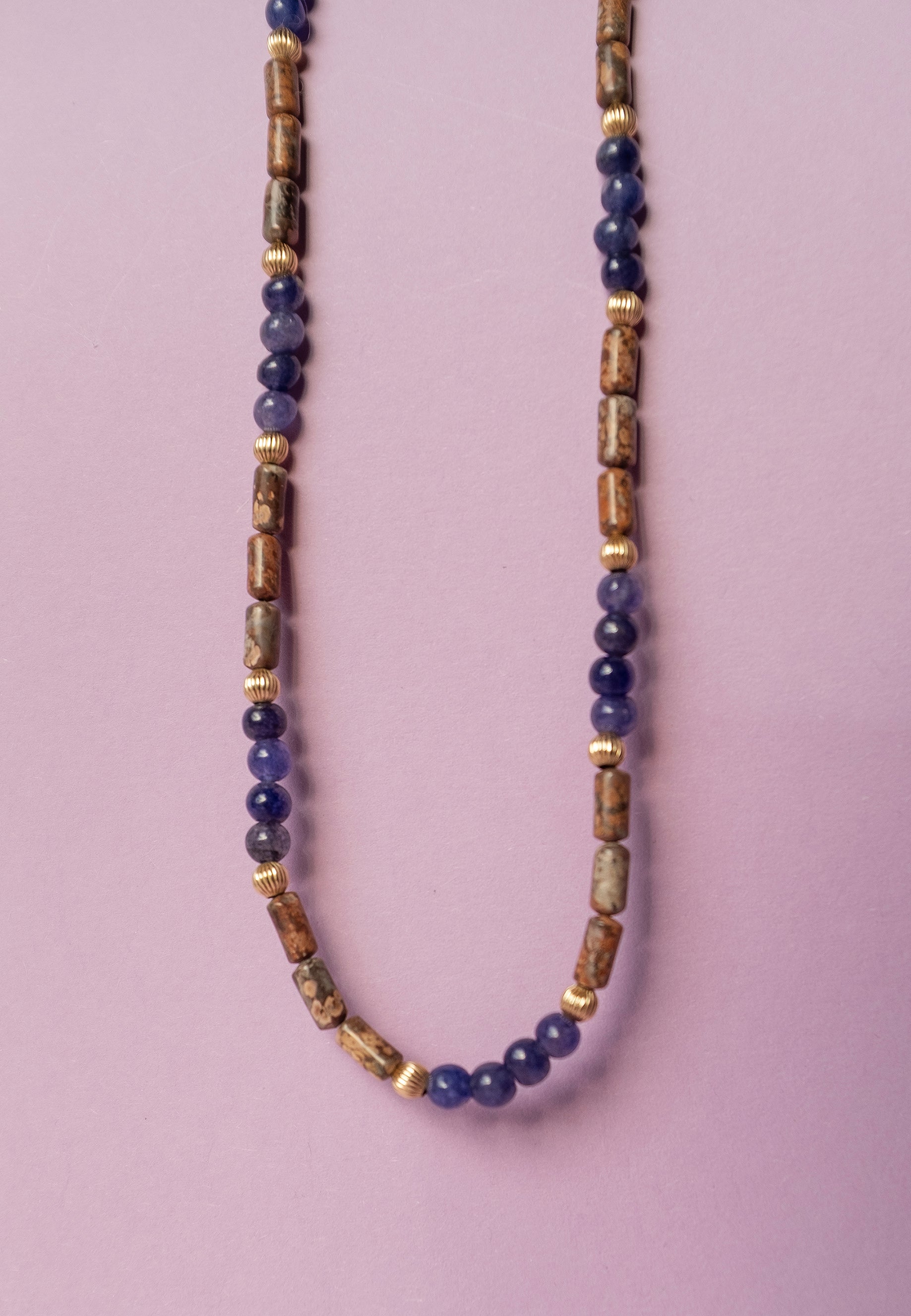 This one-of-a-kind Nema Necklace brings together vintage sapphires, jasper, and ribbed gold in a soft, natural harmony. The sapphires carry a misted blue, like morning light, while the jasper brings warm earth and quiet grounding. Together, they create a strand that feels both lived-in and refined.