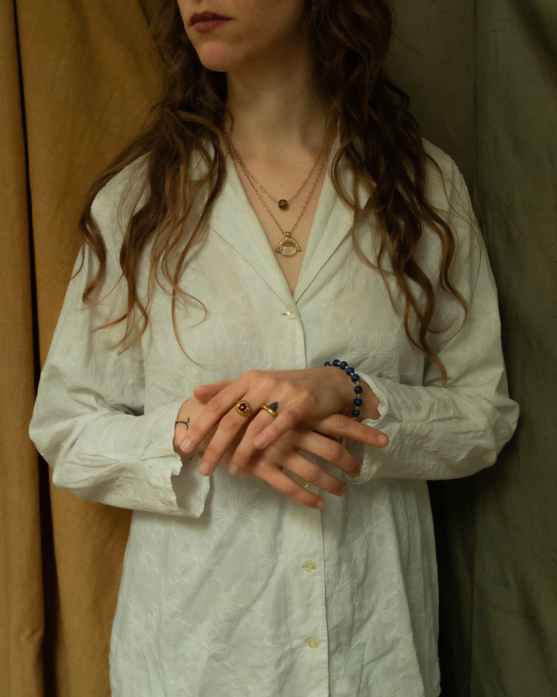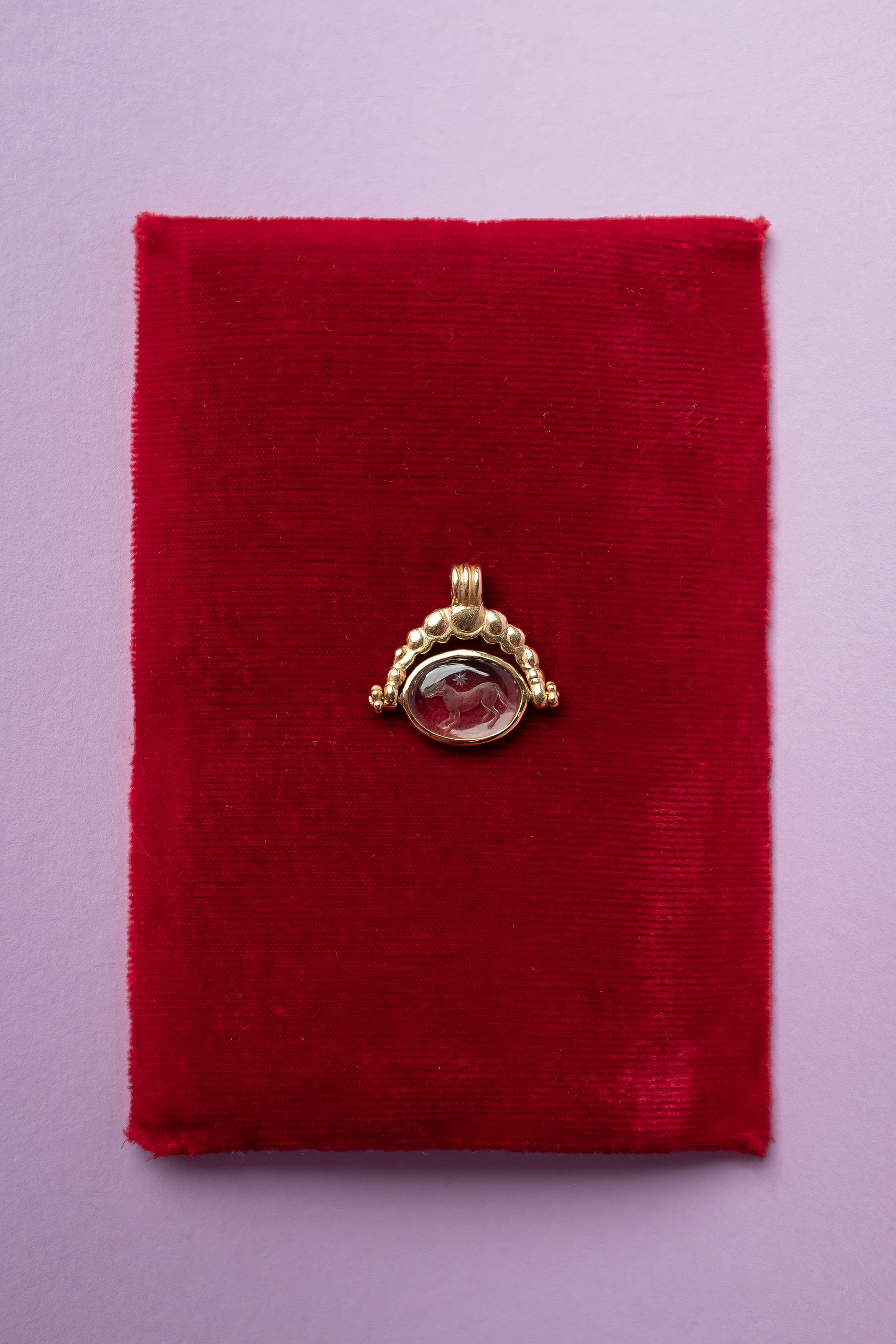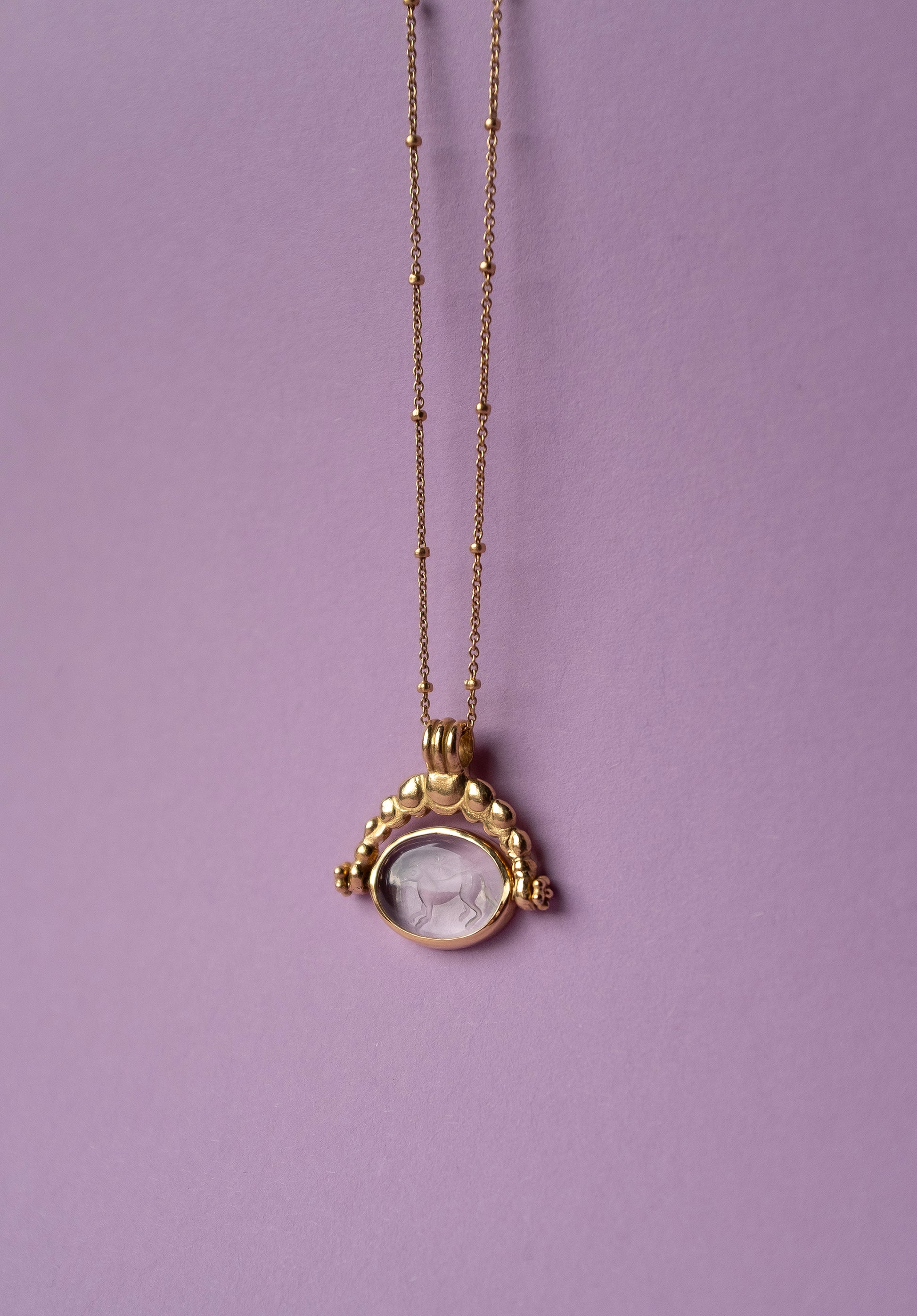 Inspired by the ornate mechanisms of antique spinners, it moves with quiet grace, a slow turning of light and shadow, like petals shifting in a late afternoon breeze. Within its curve, the centerpiece may change: a hand-carved intaglio, a glimmering gemstone, or something entirely your own. Each one transforms the pendant into a personal talisman. Intimate, living, endlessly in motion.
