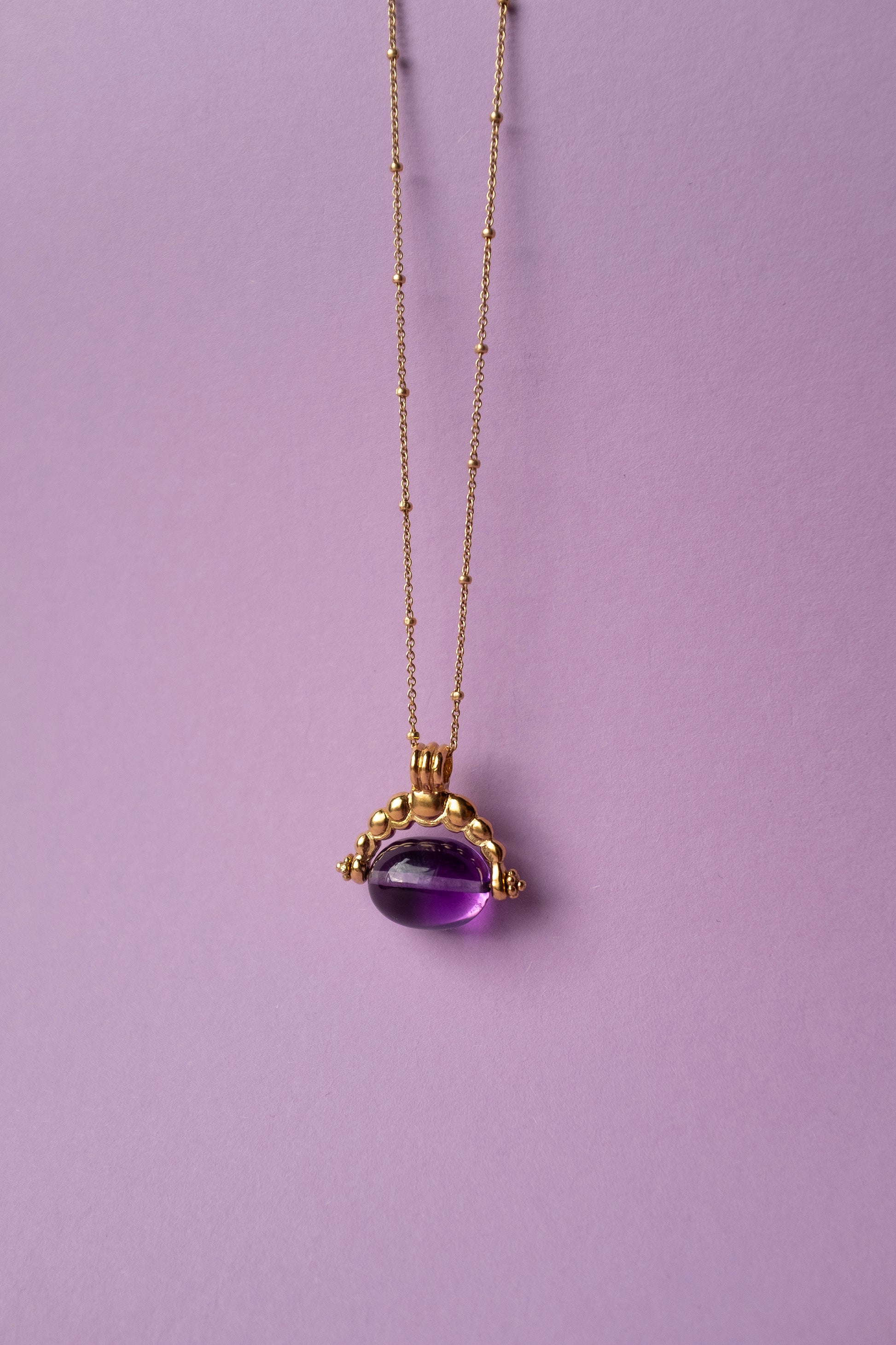 Inspired by the ornate mechanisms of antique spinners, it moves with quiet grace, a slow turning of light and shadow, like petals shifting in a late afternoon breeze. Within its curve, the centerpiece may change: a hand-carved intaglio, a glimmering gemstone, or something entirely your own. Each one transforms the pendant into a personal talisman. Intimate, living, endlessly in motion.