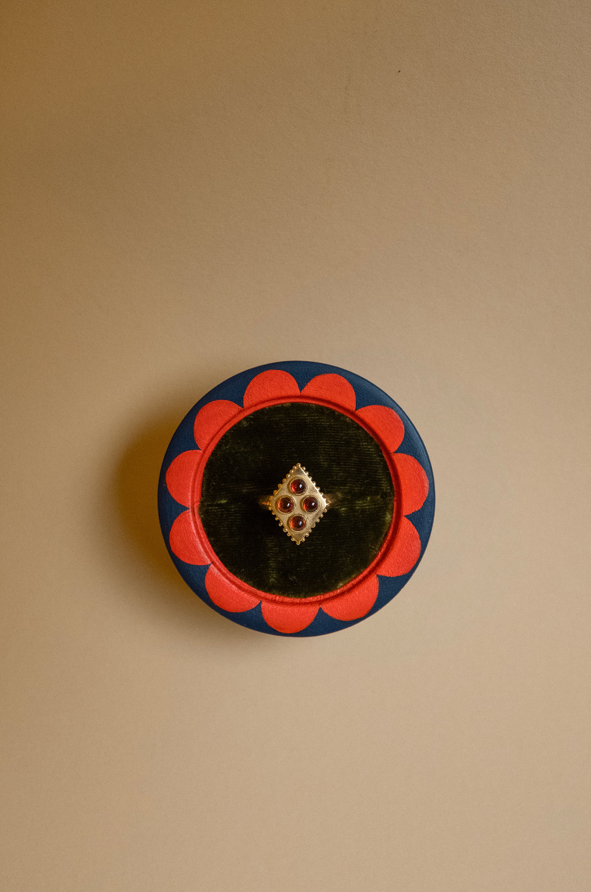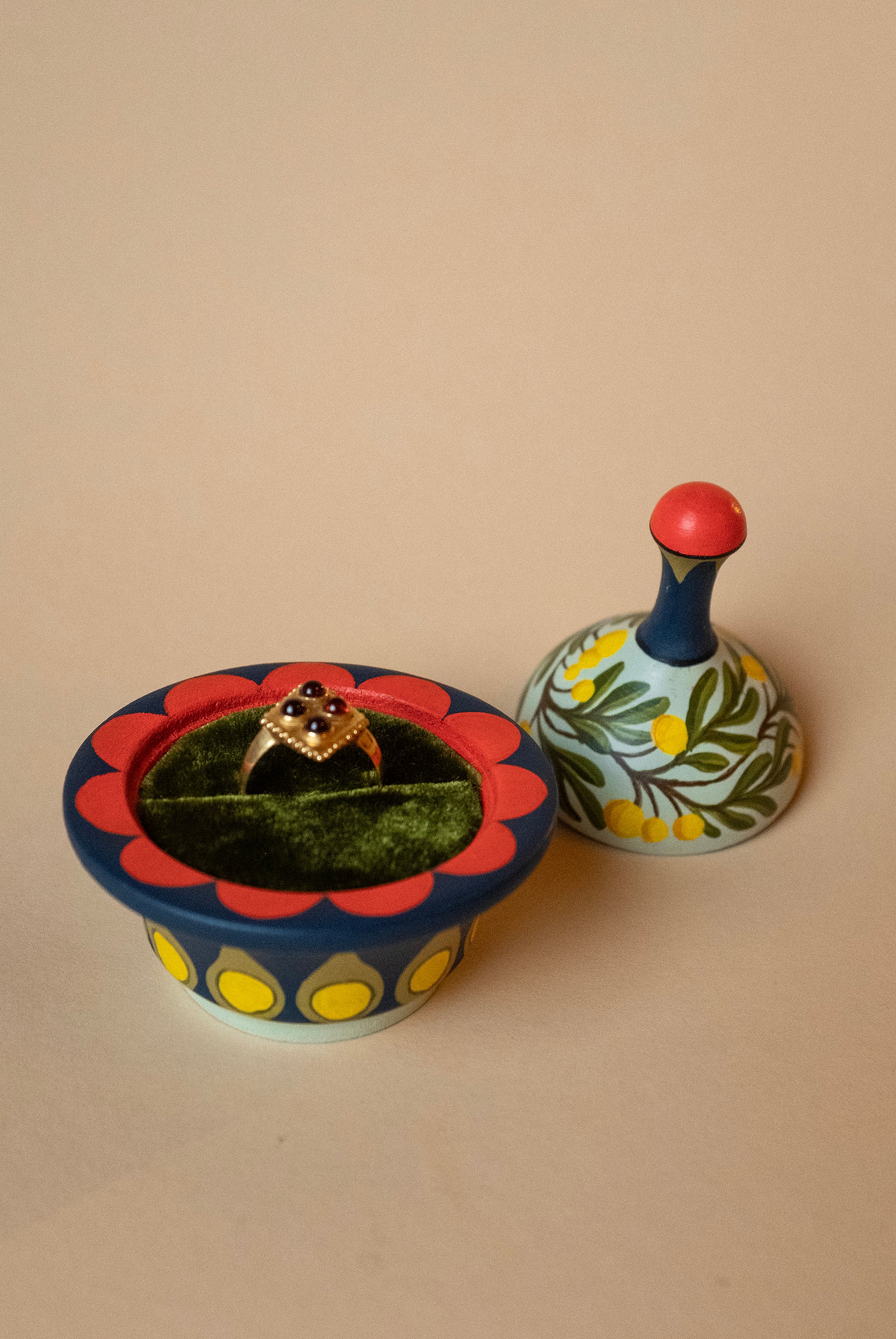 Blue botanical ringbox, part of a limited series of 3 handpainted ringboxes. Each box is completely unique, handpainted and lined with luxury silk velvet. Made to fit one ring, or two rings side by side (very convenient as a wedding ringbox). The top lid also functions as an extra ringholder.
