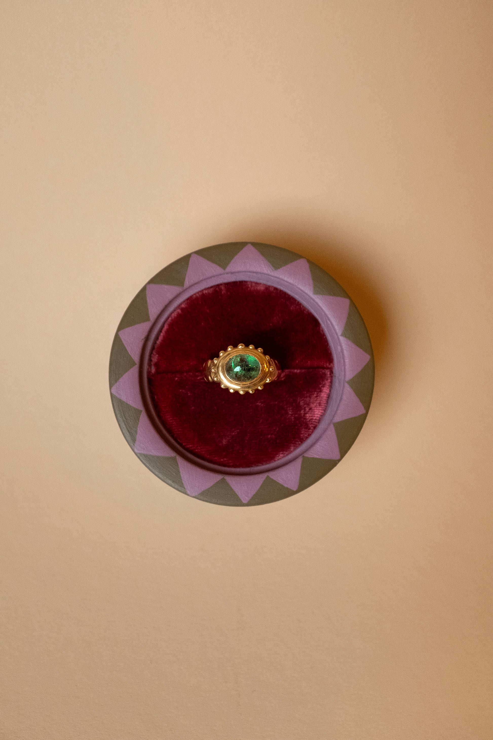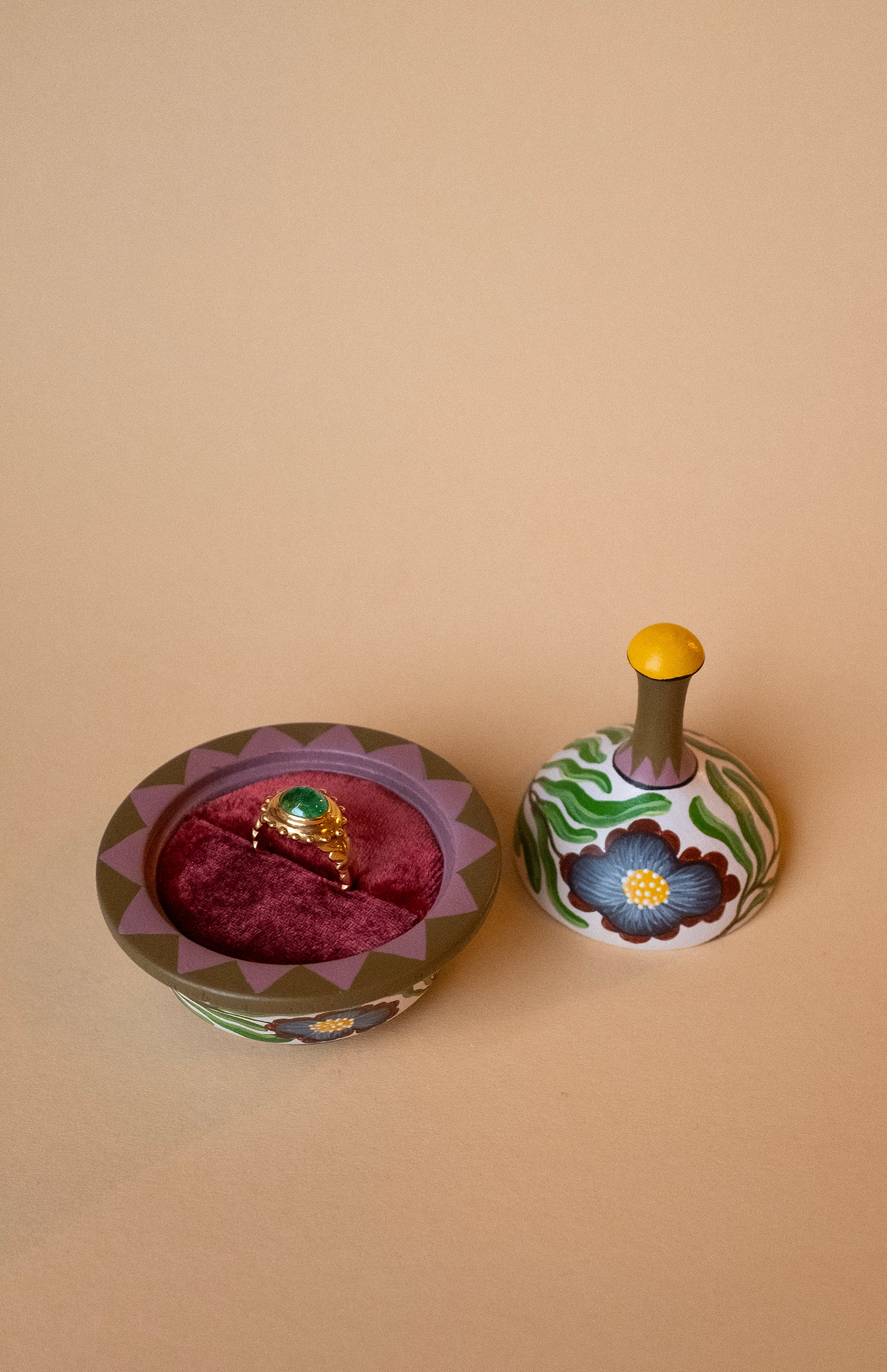 Lilac botanical ringbox, part of a limited series of 3 handpainted ringboxes. Each box is completely unique, handpainted and lined with luxury silk velvet. Made to fit one ring, or two rings side by side (very convenient as a wedding ringbox). The top lid also functions as an extra ringholder.