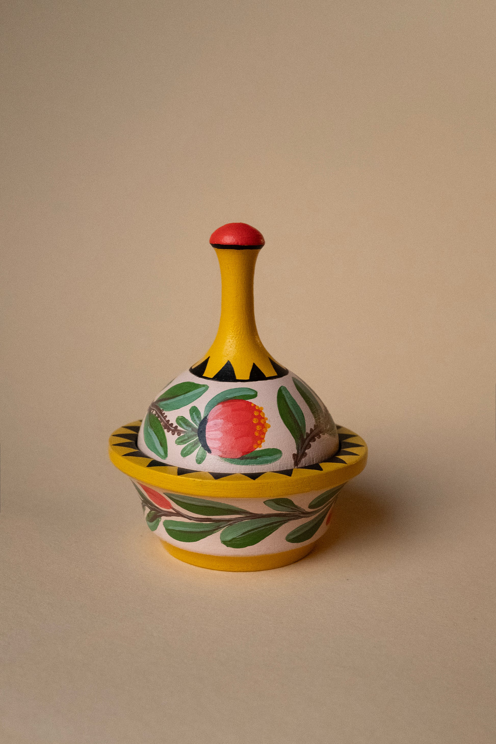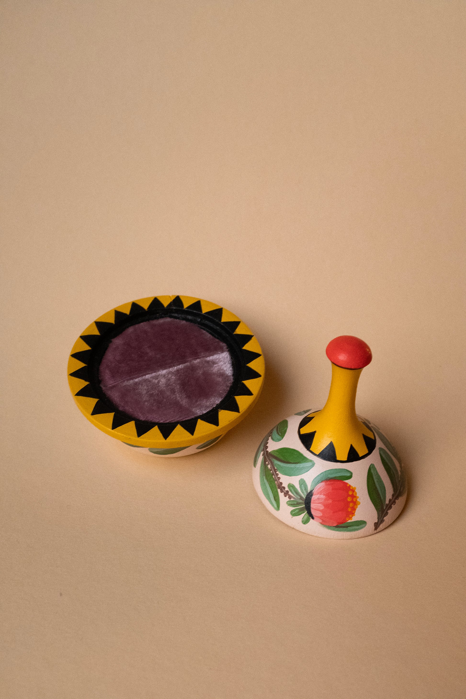 Yellow botanical ringbox, part of a limited series of 3 handpainted ringboxes. Each box is completely unique, handpainted and lined with luxury silk velvet. Made to fit one ring, or two rings side by side (very convenient as a wedding ringbox). The top lid also functions as an extra ringholder.