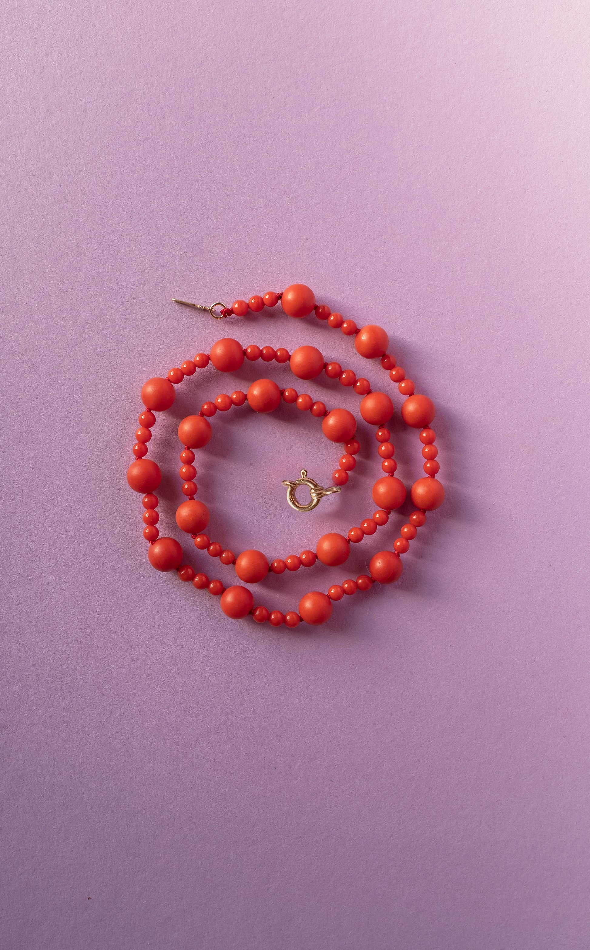 The Roselle Necklace carries the quiet charm of an heirloom. Deep red coral beads, in two gentle sizes, are strung in a soft rhythm that evokes flower buds just before bloom. The coral itself has that unmistakable richness of age: warm, smooth, and full of depth. It’s a classic strand with a subtle, natural grace, worn close to the skin, treasured and familiar.